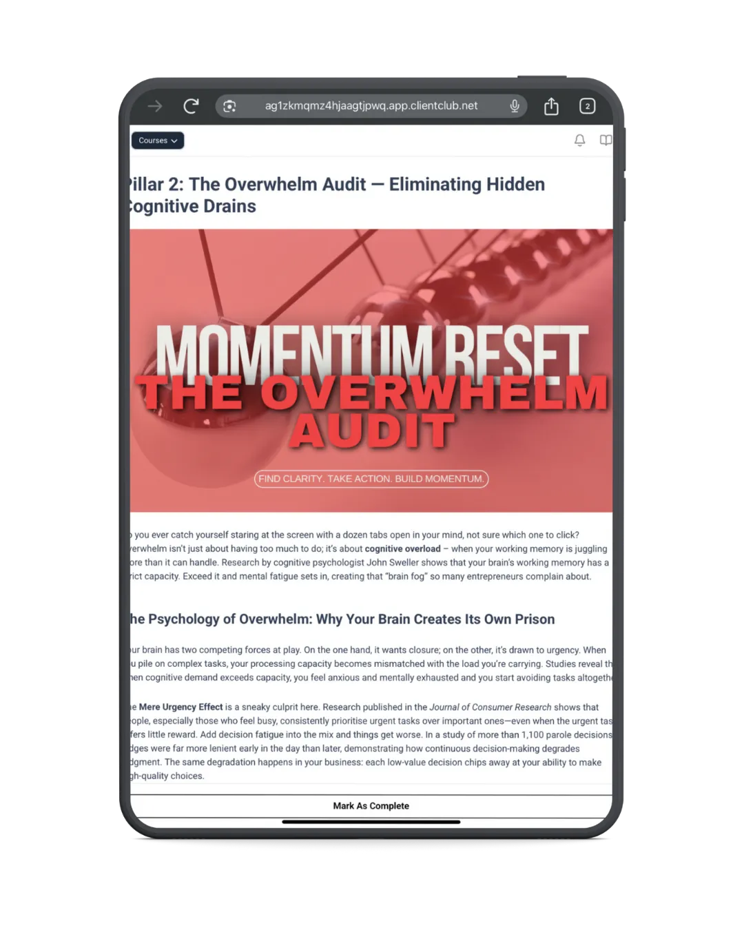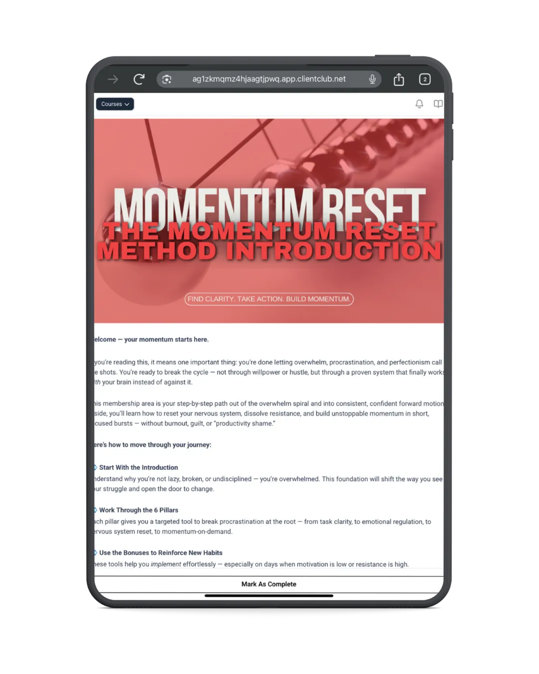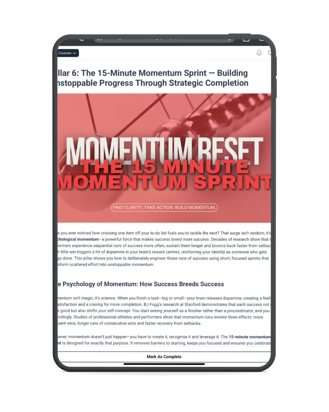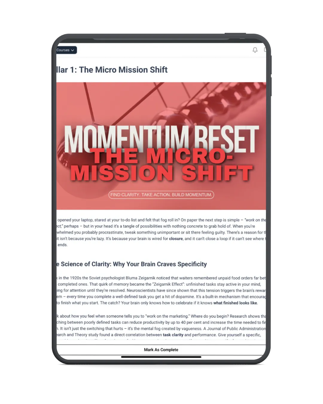 Momentum Reset Method™ Masterclass: A complete, over-the-shoulder training that walks you through the 6-pillar reset system — from mental fog and overthinking to clear, focused, daily execution in just 15 minutes a day.