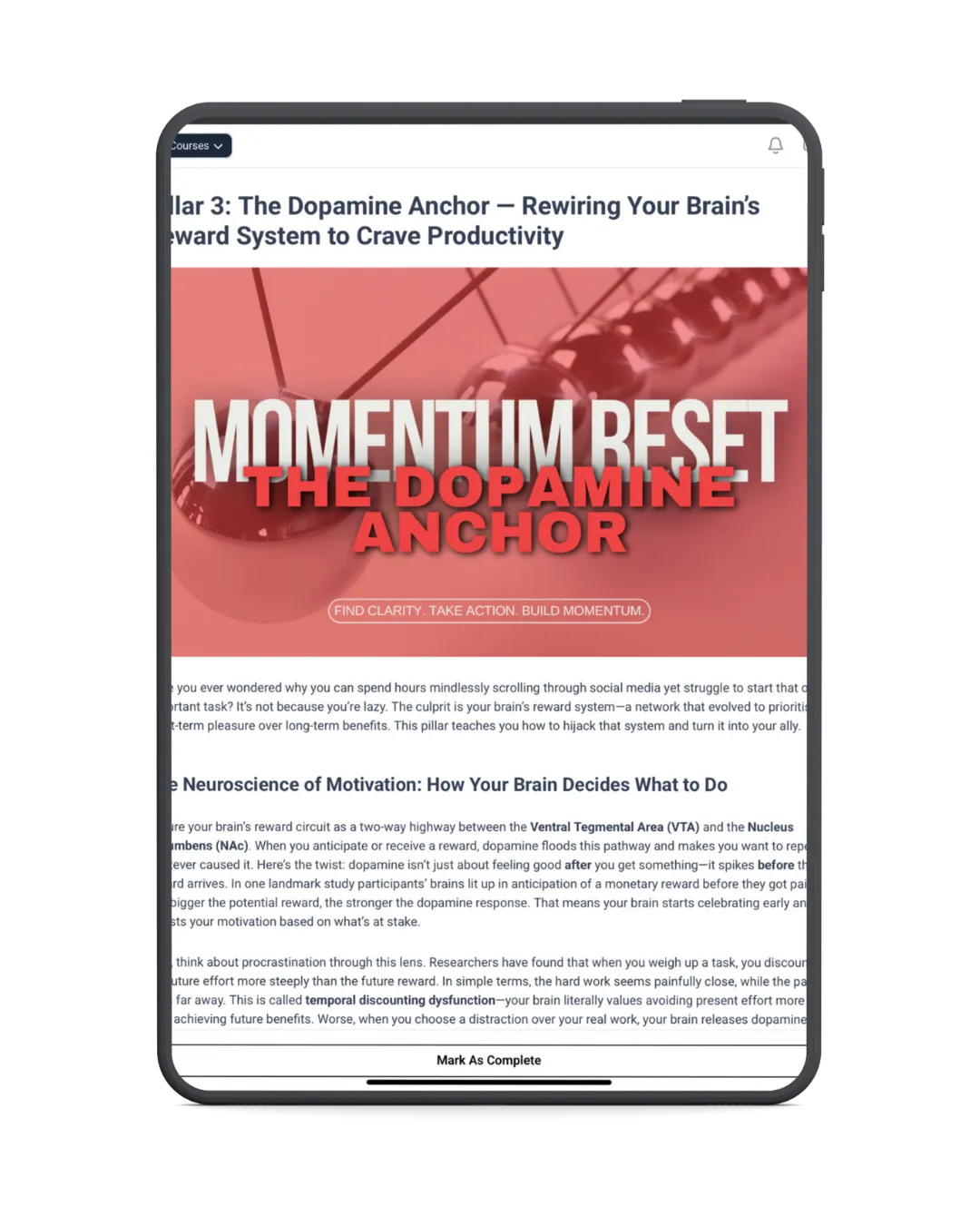 The Momentum Reset Core Protocol: A science-backed, 6-pillar protocol that rewires your brain to crave action and build unstoppable momentum — even if you’ve been stuck for months.